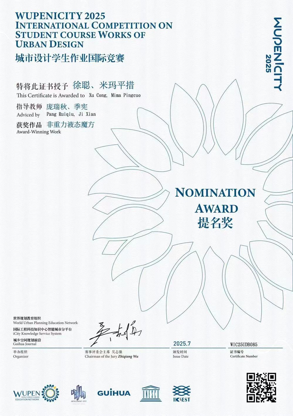 2025 WUPENiCity学生作业国际竞赛奖项于今年7月公布。近日,该竞赛的各类获奖证书由赛事主办方陆续发放。