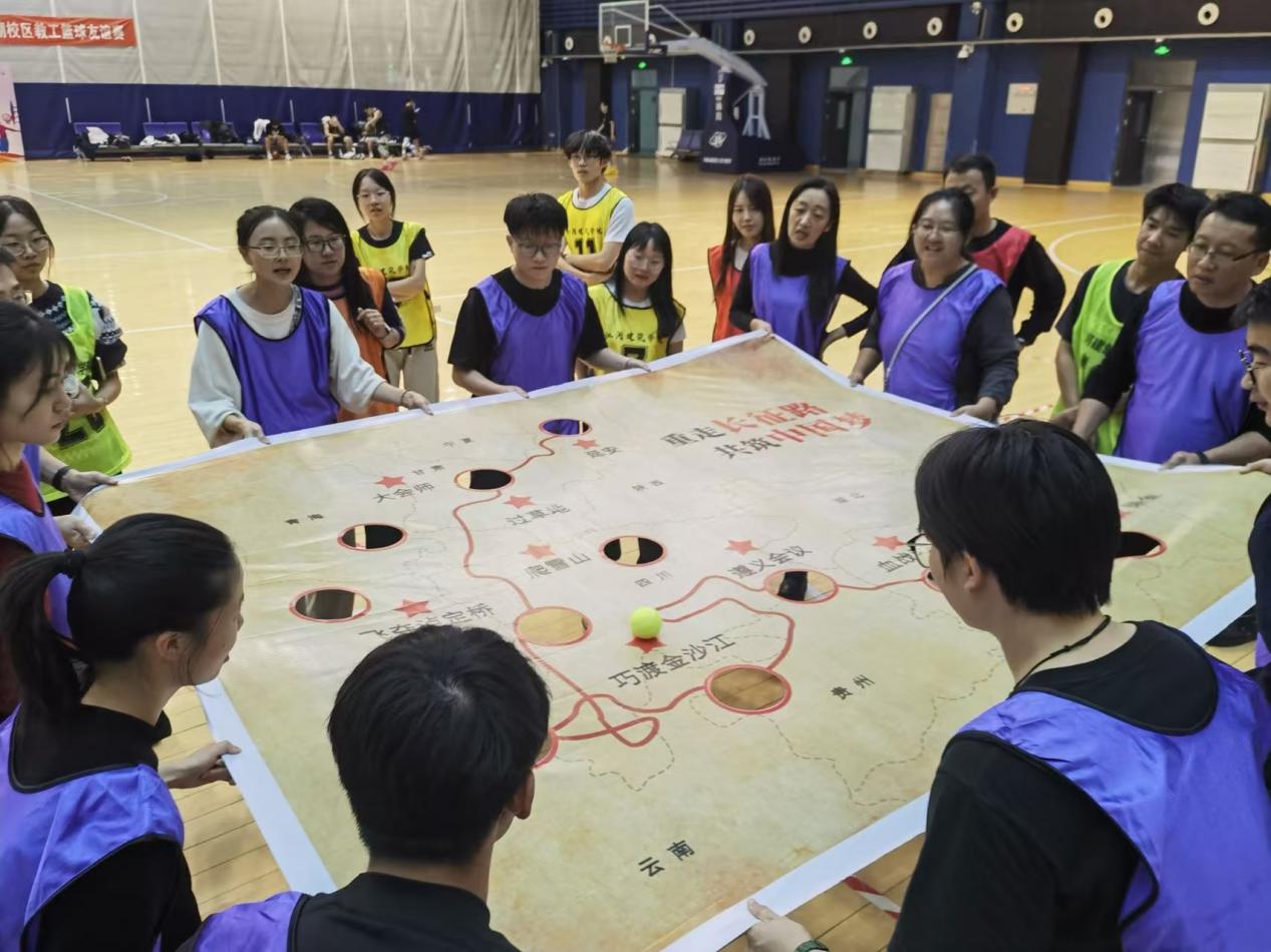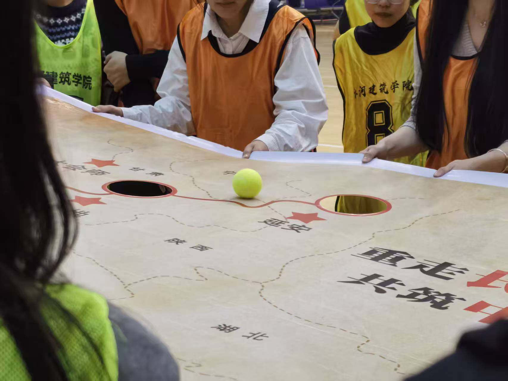 寓意深远的“重走长征路”项目,要求十二名师生共执印有长征路线的喷绘布,通过精细调整布面倾斜度,引导网球依次经过“瑞金”、“湘江”、“泸定桥”等历史节点。整个过程不能用手触碰球或布面黄线内区域,在重温光辉历程的同时,深刻体会步调一致的重要性。