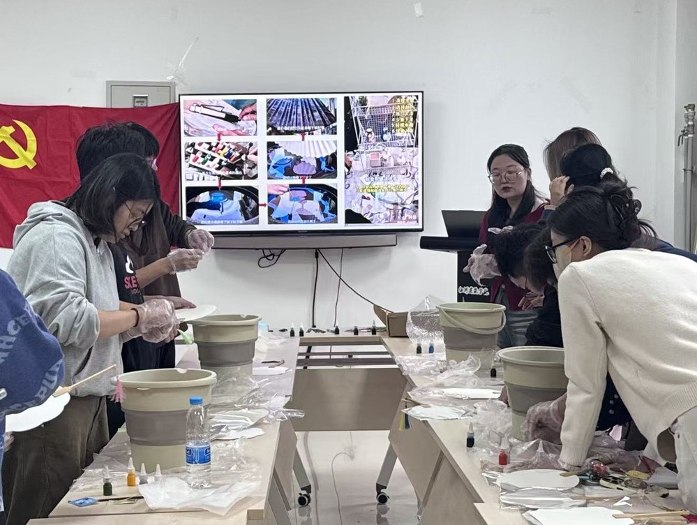 讲解让同学们明白,手中即将创作的不仅是一把扇子,更是一段可触摸的历史。核心的制作环节充满了惊喜与期待。同学们挑选心仪的色彩,将各色漆液滴入水中。漆液在水面自然晕散、交融,形成瞬息万变的肌理,犹如一幅幅抽象的建筑平面图。随后,大家屏息凝神,将洁白的扇面以不同角度缓缓浸入水中,再轻柔提起。水流与漆色在扇面上定格,每一把都是举世无双的艺术品。